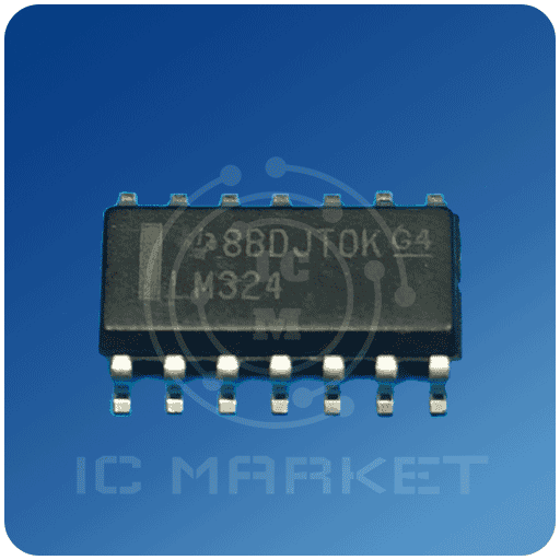 آی سی LM324 با پکیج SOIC و 14 پایه توسط شرکت Texas instruments تولید و روانه بازار میشود.